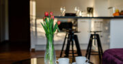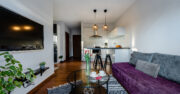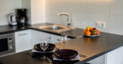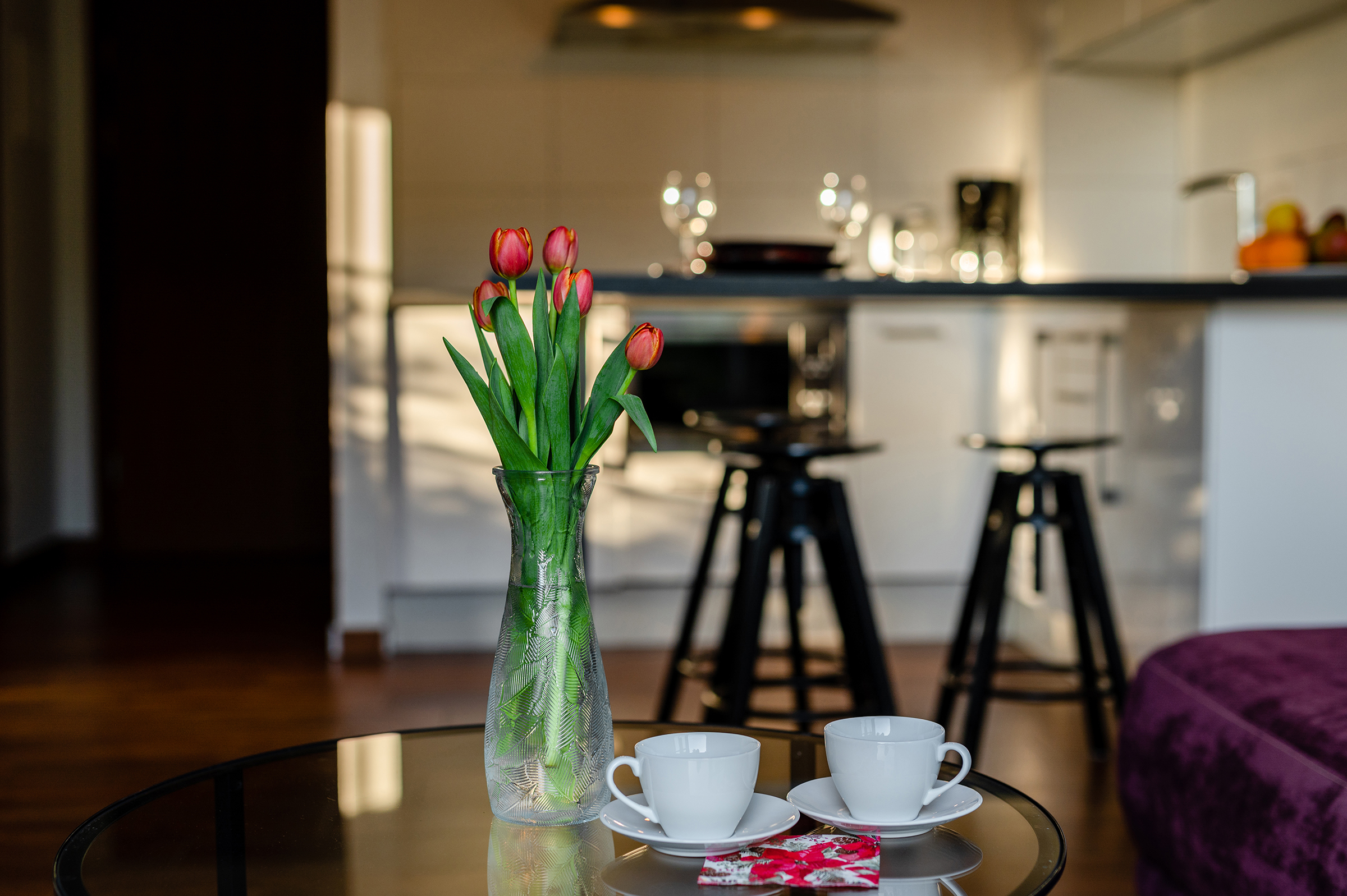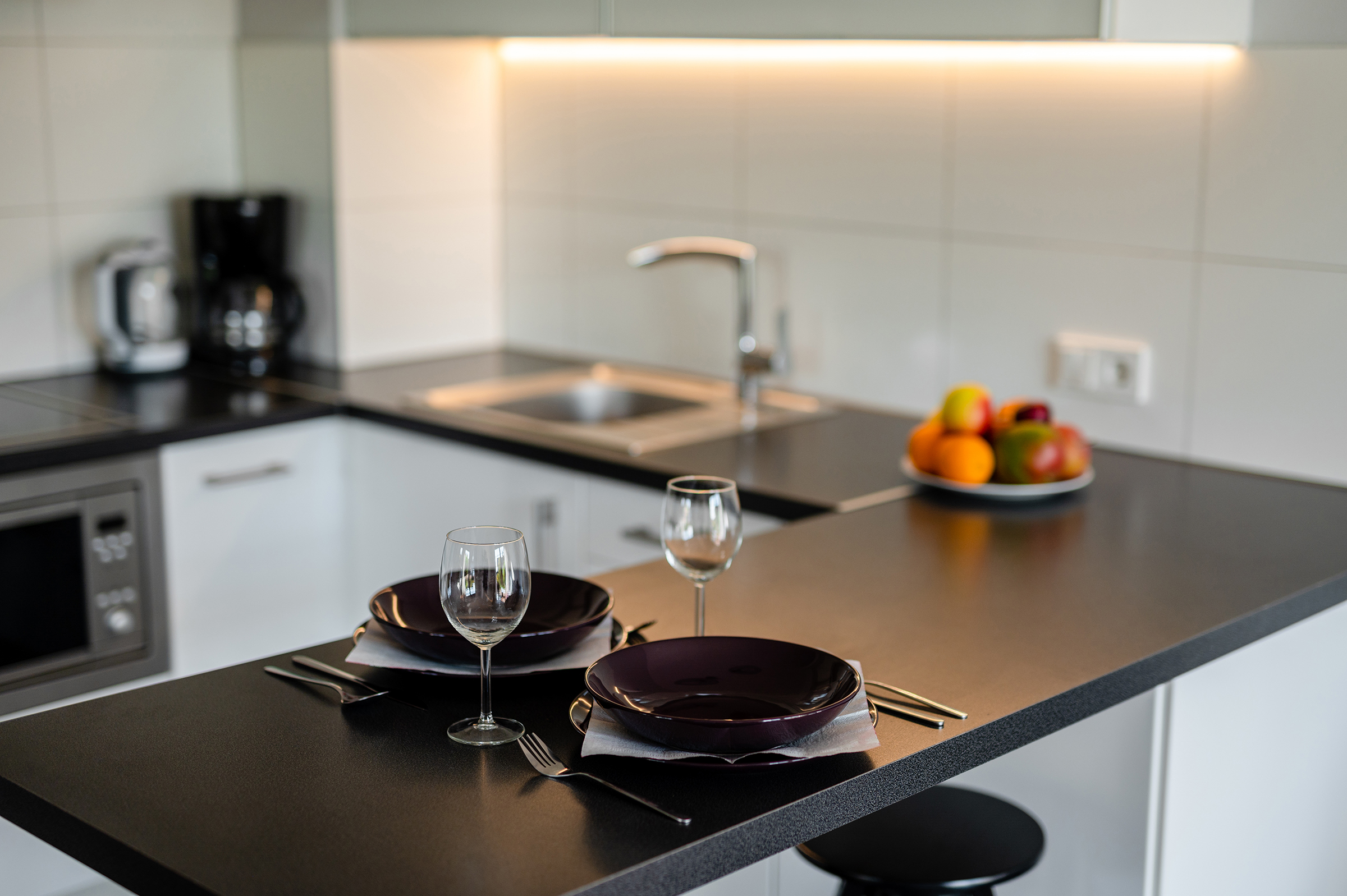- w pełni wyposażona kuchnia (mikrofala, lodówka, płyta indukcyjna, automat do kawy, naczynia – sztućce – szkło )